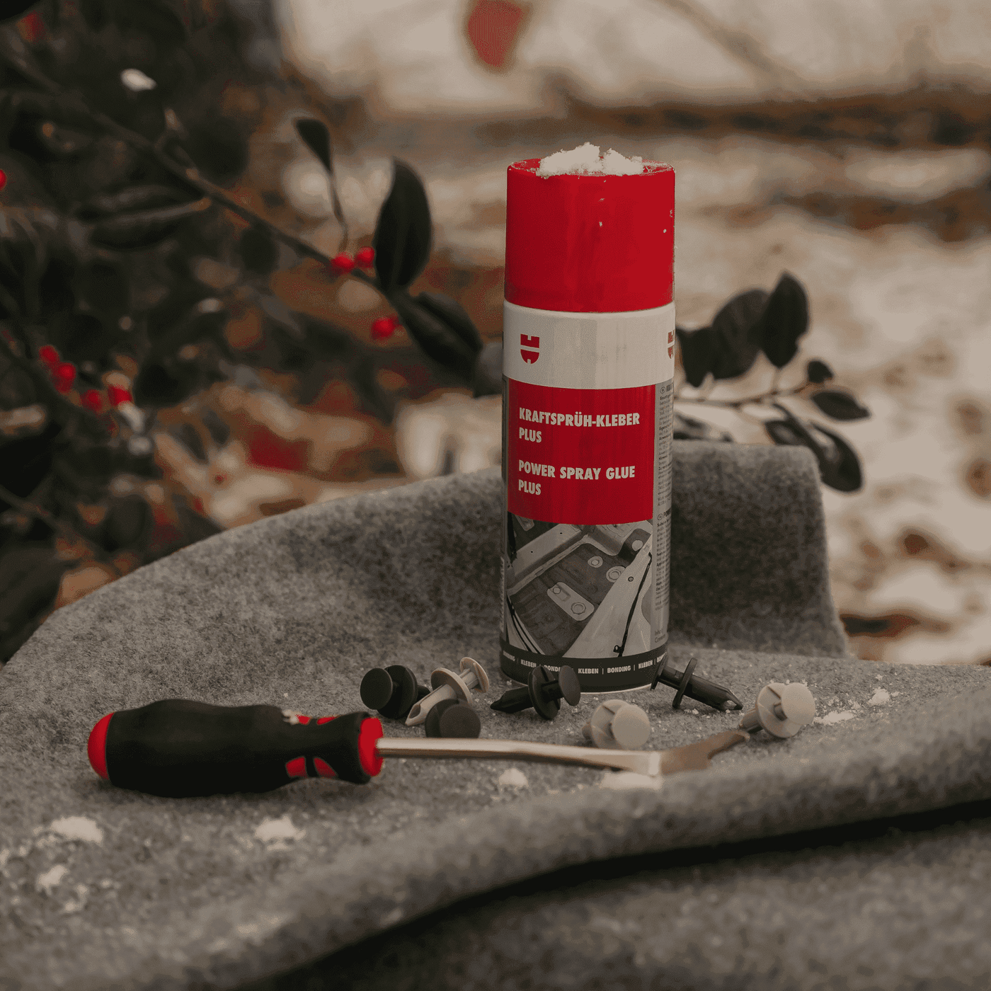 Beim Verwenden von Sprühkleber auf Filz sollten immer sowohl der Filz, als auch der Untergrund mit dem Kleber benetzt werden. Berechne daher für eine Fläche von 2m² etwa eine Flasche.