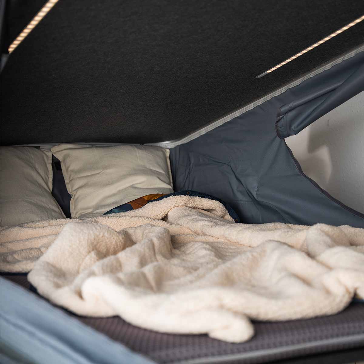 Wenn du bei niedrigen Temperaturen unterwegs bist, kann es im Aufstelldach kalt werden. Doch wenn du einige Vorkehrungen triffst, kannst du auch weiterhin problemlos darin schlafen. Ein Wetterschutz, auch “Mütze” genannt, ist ein Muss für jedes Schlafdach. Sie hält die Wärme drin und schützt vor Wind und Wetter. Hast du zusätzlich eine Standheizung im Fahrzeug, kannst du sogar bei Schnee und Minusgraden im Aufstelldach schlafen!